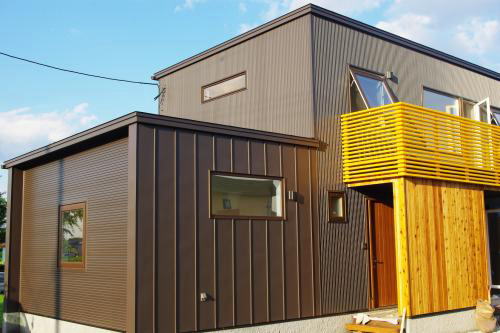 ![]() 金属サイディングと木製サイディングのアクセント ![]() オープン階段とダイニングキッチン ![]() 主寝室 ワークスペースも確保 ![]() コルク壁で夫婦の掲示板に ![]() 2階のテラスは広いので洗濯物干しだけではなく多用途 |